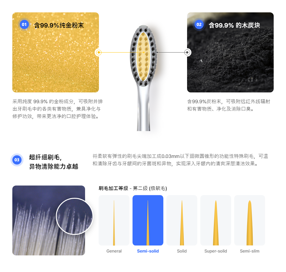 添加 99.9% 纯金粉末 / 炭粉末的功能性刷毛