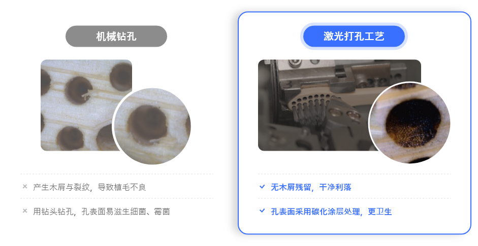 采用激光灼烧加工方式,无机械冲击,可防止竹材开裂、打孔误差及卫生隐患。