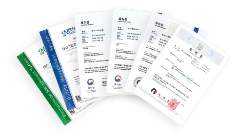 Certified Good Product Origin Indicator by the Incheon Regional Customs Certified Good Employer by the Korea Credit Guarantee Fund Issued the Main-Biz Certificate by the SMB Administration LOHAS Certificate acquired