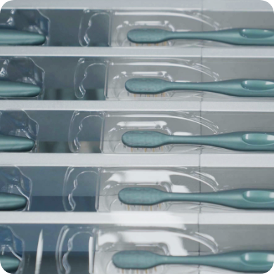 Blister shaping, insertion of toothbrush and