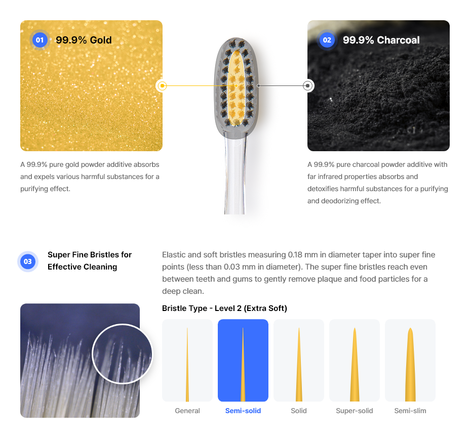 • Materials Bristles (Charcoal+Gold+PBT) / Handle (PCTG+Rubber)