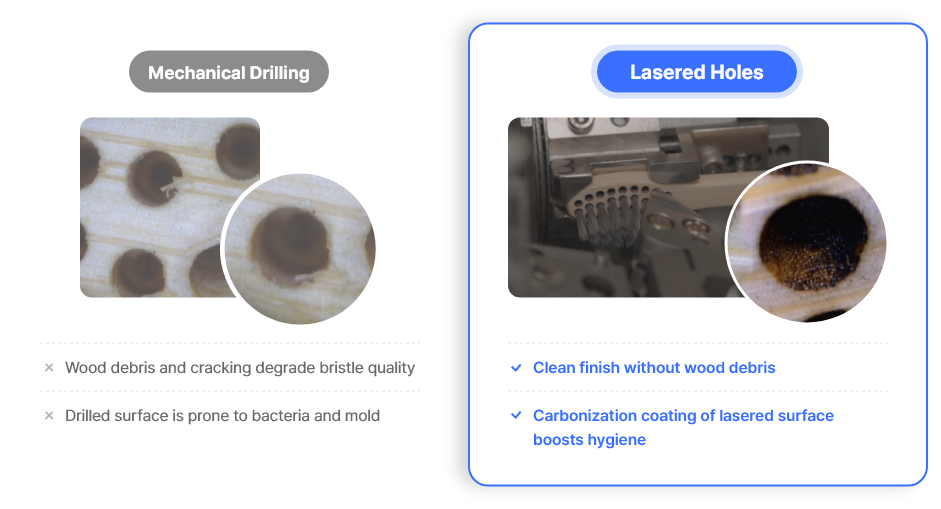 The holes in the heads of Orgeul toothbrushes that hold the bristles are not drilled but lasered using