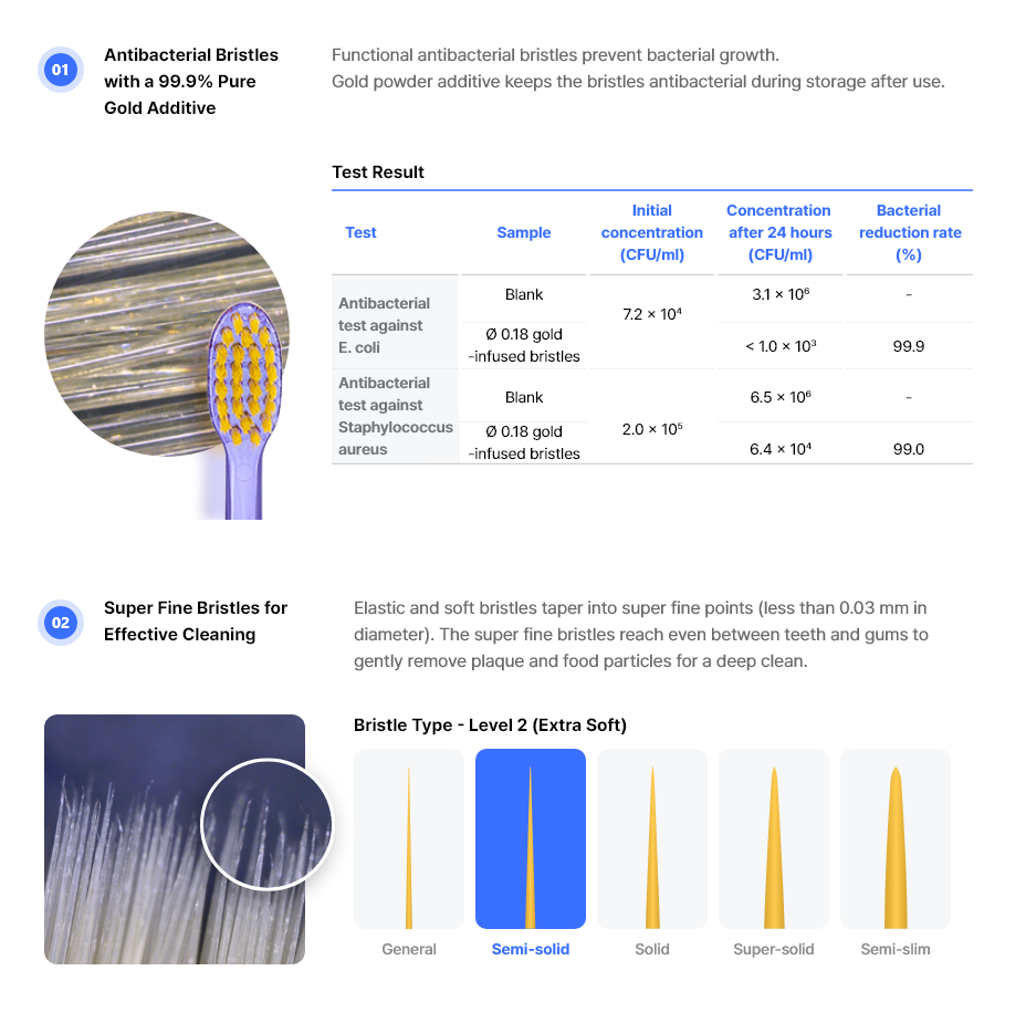 • Materials Bristles (Gold+PBT) / Handle (PCTG) / CAP (PP)